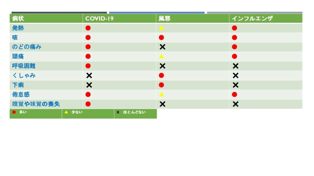 COVID-19・風邪・インフルエンザの違い 2020-03-28 最終更新日時 : 2025-11-05 moribashihk COVID-19・風邪・インフルエンザの違いは、なんでしょうか?! 下記の主な病状一覧表をご覧ください。 一番大きな違いは嗅覚や味覚の喪失があるかないかです。